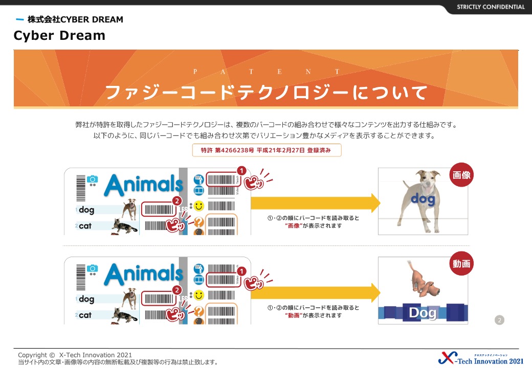 弊社で取得している特許『ファジーコードテクノロジー』は複数のバーコードの組み合せ、または複数回の読み取りで同じバーコードでも様々な映像・音声を簡単に出力する事が可能です。この機能と弊社の英語教育のノウハウを融合し、これまではCD・DVDのような受け身のレッスンしか出来なかった英語教育を、インタラクティブ(双方向)かつオンデマンドで行えるようになりました。